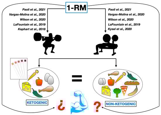 Ketogenic and non-ketogenic protocols with similar 1-RM results [,,,,].