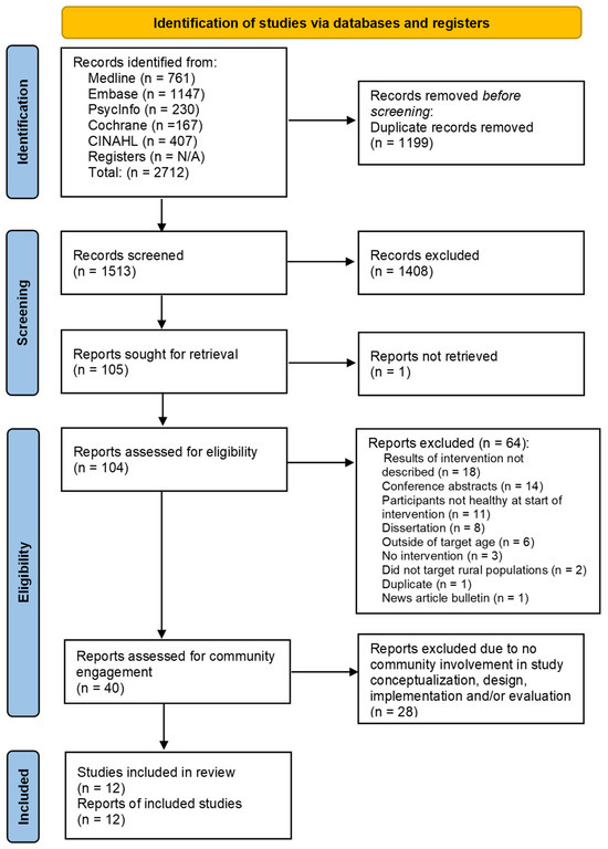 While various terms describe community participation in research, “community-engaged research” is the term used throughout this paper [23]. Community-engaged research involves collaboration between community members and researchers to develop, implement, and/or evaluate an intervention [24,25]. Key et al. [26] demonstrated that community engagement occurs at different levels, ranging from no involvement to community-driven initiatives, with increased involvement linked to increased long-term adherence, satisfaction, and acceptance [27]. Given rural populations’ historically low participation rates in research [28], community-engaged research may be especially important for enhancing intervention engagement and effectiveness in rural communities. This review thus explored community engagement in obesity prevention interventions targeting school-aged youth living in rural communities in the US.