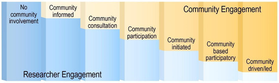 - Key, K.D.; Furr-Holden, D.; Lewis, E.Y.; Cunningham, R.; Zimmerman, M.A.; Johnson-Lawrence, V.; Selig, S. The continuum of community engagement in research: A roadmap for understanding and assessing progress. Prog. Community Health Partnersh. 2019, 13, 427–434. [Google Scholar] [CrossRef]