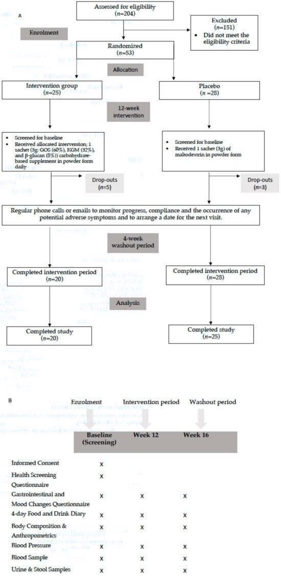 Two hundred and four volunteers were recruited from the local community and social media platforms such as Facebook or Instagram, which were widely used among adults. After completing a medical questionnaire at the first visit (baseline) to assess study eligibility, 53 volunteers (intervention: n = 25; placebo: n = 28) met the inclusion criteria and agreed to participate, while 151 volunteers were excluded. Five volunteers in the intervention group and three in the placebo group dropped out due to GI symptoms and personal issues but were screened for baseline.