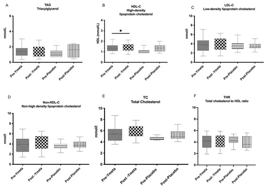 Changes in biochemical parameters from baseline to week 12. (A) Triaglycerol; (B) high-density lipoprotein cholesterol (HDL-C); (C) low-density lipoprotein cholesterol (LDL-C); (D) non-high-density lipoprotein cholesterol (non-HDL-C; (E) total cholesterol (TC); (F) total cholesterol to HDL-C ratio (THR). Data are presented as box plots with maximum value, 75th percentile (upper line of box), median (middle line of box), 25th percentile (lower line of box), and minimum. p value less than 0.05 (* two-sided p value) was considered statistically significant.