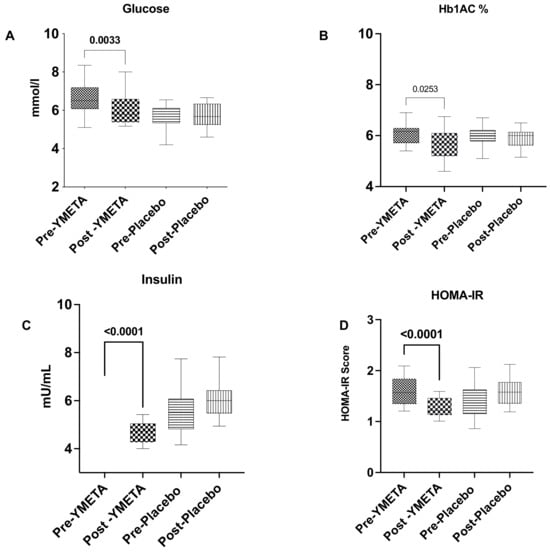 Changes in glucose biomarkers from baseline to week 12. (A) Fasting plasma glucose; (B) HbA1c%; (C) insulin; (D) HOMA-IR. Data are presented as box plots with maximum value, 75th percentile (upper line of box), median (middle line of box), 25th percentile (lower line of box), and minimum. p value less than 0.05 (two-sided p value) was considered statistically significant.