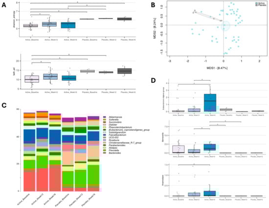 The gut microbiota of the enrolled individuals was profiled over time to assess whether the different gut microbiota layouts and trajectories were associated with YMETA supplementation (Figure 4). Alpha diversity significantly increased in the YMETA group at week 12 (p = 0.04, Wilcoxon test; Figure 4A). As for beta diversity, the PCoA of inter-sample variation based on Bray–Curtis dissimilarities (Figure 4B) showed significant segregation between the YMETA and placebo groups, regardless of time point (p = 0.01; PERMANOVA), suggesting distinctive features of the gut microbiota among the study groups.