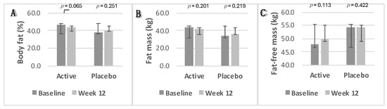 In the intervention group, body fat percentage and fat mass decreased slightly from 46.4% to 44% (p = 0.06) and from 43.2 kg to 41.9 kg (p = 0.2), respectively. Fat-free mass increased from 47.9 kg to 49.7 kg (p = 0.113). In the placebo group, body fat percentage and fat mass increased slightly from 38.20% to 40.08% (p = 0.2) and from 33.77 kg to 36.25 kg (p = 0.2), respectively, with minimal change in fat-free mass from 54.19% to 54.10% (p = 0.4). Changes in body composition parameters were not statistically significant in either group (p ≥ 0.05). Box plots depicting these changes from baseline to week 12 are shown in Figure 5A—body fat percentage; Figure 5B—fat mass; and Figure 5C—fat-free mass.