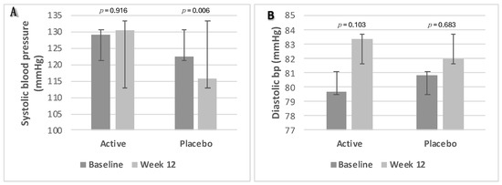 There was a significant decrease in SBP in the placebo group, from 123 mmHg to 116 mmHg (p = 0.006). However, no significant changes in systolic or diastolic BP were found between the two groups (p ≥ 0.05). Changes in BP parameters from baseline to week 12 are presented as box plots in Figure 6A—systolic blood pressure and Figure 6B—diastolic blood pressure.