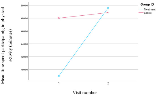 No significant differences were observed between the groups at baseline regarding physical activity. However, the mean time spent on physical activity numerically increased from 390 to 496 min in the treatment group and from 480 to 489 min in the control group. Although these changes did not reach statistical significance, the increase in the average time spent on physical activity was more pronounced in the treatment group compared to the control group, and it is clinically relevant. The changes in physical activity of the groups are outlined in Figure 1.