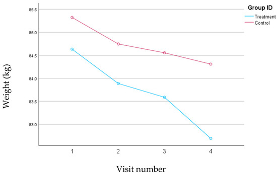 Changes in weight (kg) for the treatment and control groups during the 30-day follow-up period, with study visits scheduled every 10 days.