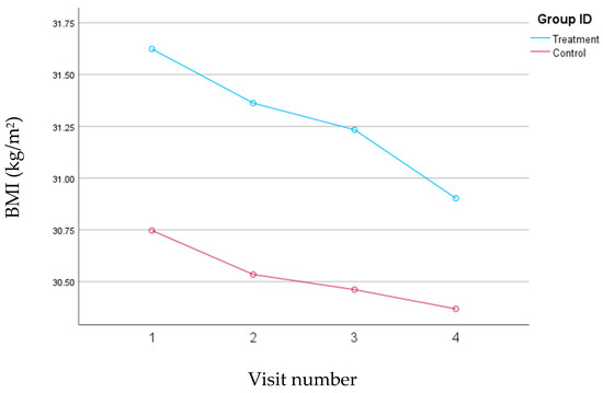 Changes in BMI (kg/m2) for the treatment and control groups during the 30-day follow-up period, with study visits scheduled every 10 days.