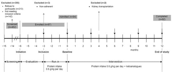 Of the 452 screened patients, 213 refused to participate and 142 did not meet the selection criteria. Only 97 patients (21% of 452) were enrolled in the Run-In phase. Three patients were not adherent to the LPD and were excluded. During the study, 2 patients received a preemptive kidney transplant. The possibility of the kidney transplant was constrained by graft availability, not patient necessity.