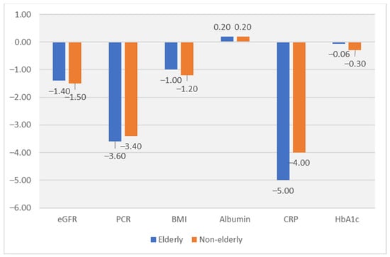 In elderly patients, nutritional and inflammatory status improved. Serum albumin increased by 0.3 g/dL, from 3.9 g/dL to 4.2 (Table 2 and Table 3, Figure 2). CRP decreased by 5 mg/L during the study period (Table 3, Figure 2). BMI decreased from 27.1 kg/m2 to 25.7 (Table 2, Figure 2). The management of carbohydrate metabolism was not influenced by dietary interventions. HbA1c levels did not change during the study (Table 2 and Table 3, Figure 2).