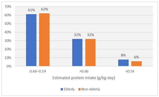 At inclusion, the median estimated protein intake was 0.9 g/kg per day and decreased, as per recommendation, to 0.69 g/kg per day at baseline (Table 1 and Table 2). During the study, compliance to LPD significantly increased, with a difference in the estimated protein intake of −0.03 g/kg per day between EOS and baseline (Figure 2). In the Intervention phase, in 61% of cases the estimated protein intake was between 0.54 and 0.66 g/kg-day in elderly, and only in 8% cases the estimated protein intake (EPI) was lower than 0.54 g/kg-day (Figure 3).
