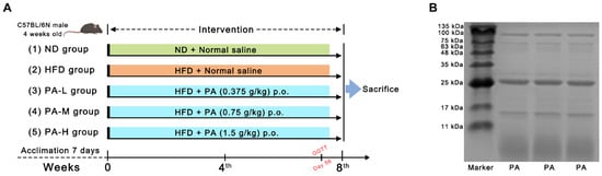 Experiment design and protein pattern of PA. (A) Detailed program of PA oral administration throughout the experiment period. (B) SDS-PAGE visualization for PA.