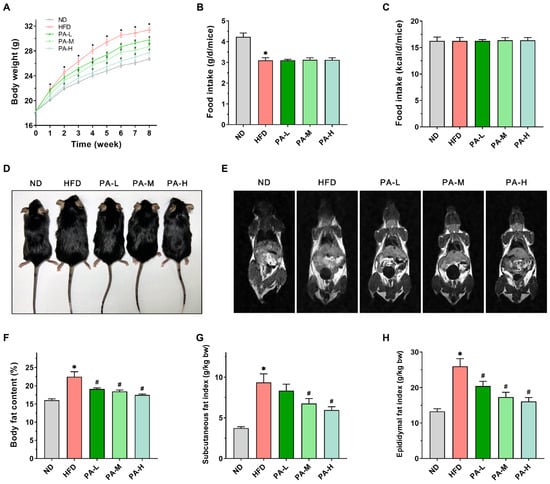 Effects of PA on body weight and fat accumulation in HFD-induced mice. (A) Body weight changes from week 0 to week 8. (B) Daily food intake per mouse in grams. (C) Daily energy intake per mouse. (D) Representative photos of the mice after 8 weeks. (E) Representative coronal sections of MRI studies. (F) Body fat percentage in mice. (G) Subcutaneous fat mass index. (H) Epididymal fat mass index. Results are expressed as mean ± SEM. n = 8 per group. * p < 0.05, HFD vs. ND; # p < 0.05, HFD vs. PA-L, PA-M, or PA-H.