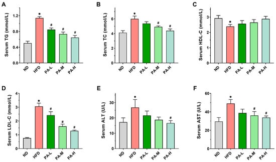 Effects of PA on serum lipid profiles in HFD-induced mice. (A–D) Serum TG, TC, HDL-C, and LDL-C levels. (E,F) Serum ALT and AST activities. Results are expressed as mean ± SEM. n = 8 per group. * p < 0.05, HFD vs. ND; # p < 0.05, HFD vs. PA-L, PA-M, or PA-H.