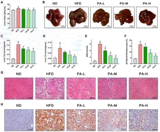 Effects of PA on hepatic steatosis in HFD-induced NAFLD mice. (A) Liver index. (B) Representative photos of livers. (C,D) Liver TG and TC levels. (E) NAFLD activity score of the liver. (F) Oil Red O-positive area of the liver. (G) Representative H&E stains of a liver section (Scale bar = 100 μm). (H) Representative Oil Red O stains of a liver section (Scale bar = 100 μm). Results are expressed as mean ± SEM. n = 8 per group. * p < 0.05, HFD vs. ND; # p < 0.05, HFD vs. PA-L, PA-M, or PA-H.