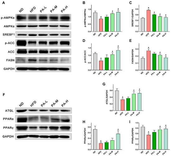 Effects of PA on the expression of lipid metabolism-related proteins in the liver of HFD-induced NAFLD mice. (A) Representative Western blots of markers for lipogenesis in the liver. (B–E) Quantification of protein expression of p-AMPKα/AMPKα, SREBF1, p-ACC/ACC, and FASN. (F) Representative Western blots of markers for lipolysis in the liver. (G–I) Quantification of protein expression of ATGL, PPARα, and PPARγ. Results are expressed as mean ± SEM. n = 6 per group. * p < 0.05, HFD vs. ND; # p < 0.05, HFD vs. PA-L, PA-M or PA-H.