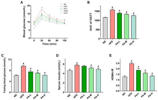 Effects of PA on glucose metabolism in HFD-induced mice. (A) Blood glucose profile of OGTT at week 7. (B) AUC measured during OGTT. (C) Fasting blood glucose levels in mice. (D) Serum insulin levels in mice. (E) HOMA-IR index in mice. Results are expressed as mean ± SEM. n = 8 per group. * p < 0.05, HFD vs. ND; # p < 0.05, HFD vs. PA-L, PA-M, or PA-H.