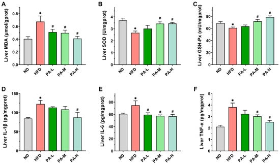 Effects of PA on hepatic oxidative stress and inflammatory response in HFD-induced mice. (A–F) Levels of MDA, SOD, GSH-Px, IL-1β, IL-6, and TNF-α in the liver of mice. Results are expressed as mean ± SEM. n = 8 per group. * p < 0.05, HFD vs. ND; # p < 0.05, HFD vs. PA-L, PA-M, or PA-H.