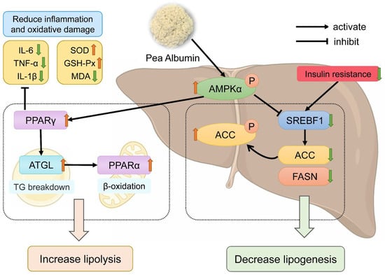 Schematic illustration of the mechanism of pea albumin in ameliorating HFD-induced NAFLD. The red upward arrows represent increase; the green downward arrows represent decrease.