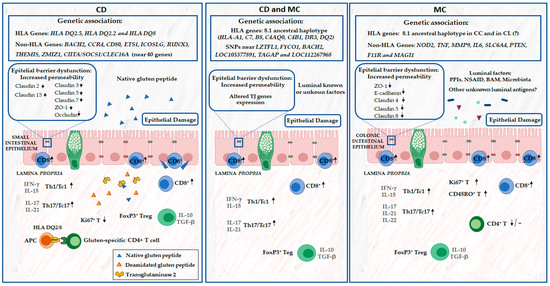 Genetic susceptibility, epithelial barrier dysfunction and adaptative immunity in both celiac disease (CD) and microscopic colitis (MC) intestinal mucosa. ↑ increased expression and/or cell population; ↓ decreased expression and/or cell population.
