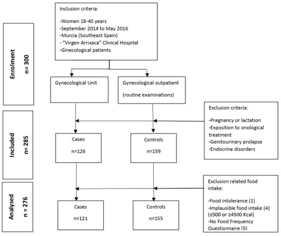 This case–control study was conducted from September 2014 to May 2016 at the Department of Obstetrics and Gynaecology of the University Clinical Hospital “Virgen de la Arrixaca” (HCUVA), in Murcia, Spain []. Women were excluded if they were under 18 or over 40 years of age, pregnant or breastfeeding, undergoing cancer treatment, had genitourinary prolapse or endocrine disorders (e.g., Cushing’s syndrome, congenital adrenal hyperplasia, androgen-secreting tumors, hyperprolactinemia, and hypo- or hyperthyroidism), or had taken any hormonal medication, including contraceptives, within the 3 months preceding this study []. The methods have been described in greater detail in previous publications [,]. Figure 1 shows the number of participants enrolled, included, and analyzed. Briefly, a total of 300 gynecological outpatients were screened at the gynecology department of the HCUVA, with 285 finally included in this study []. The sample included 126 patients diagnosed with PCOS and 159 controls. We excluded 9 women due to incomplete Food Frequency Questionnaires (n = 5), those reporting an implausible energy intake (≤500 or ≥4500 kcal/day), or those who presented having a food allergy (n = 1). The controls were women who visited the clinic for gynecological check-ups and had no gynecological pathologies [].