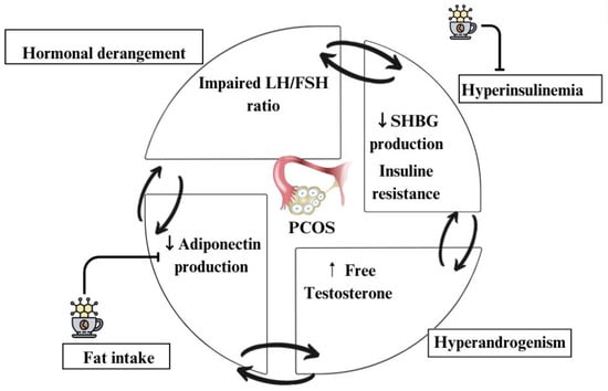 Furthermore, some studies suggest that coffee consumption affects the regulation of PCOS-related hormones [,]. In women with PCOS, there is a disruption in ovarian function, and the hypothalamic–pituitary axis is implicated due to abnormal and irregular secretion of the Follicle–Stimulating Hormone (FSH) and the Luteinizing Hormone (LH). Altered leptin levels, impacting GnRH release, further disrupt the hypothalamic–pituitary–gonadal axis and may lead to excess androgen synthesis associated with PCOS []. Coffee extract may reduce circulating leptin levels, ultimately contributing to enhanced steroidogenesis [,].