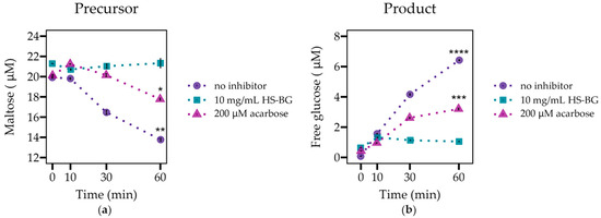 The evaluation of α-glucosidase activity (n = 3) as shown by (a) maltose degradation and (b) glucose generation, when incubated with maltose in the presence and absence of 10 mg/mL of HS-BG fiber. Acarbose 200 µM served as a positive control of inhibition (**** p ≤ 0.0001, *** p ≤ 0.001, ** p ≤ 0.01, * p ≤ 0.05).