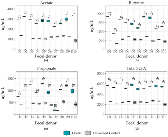 Short-chain fatty acid production after 24 h fecal fermentation (10 donor samples, n = 3) for metabolites of (a) acetate, (b) butyrate, and (c) propionate, and (d) total SCFA production (*** p ≤ 0.001, ** p ≤ 0.01, * p ≤ 0.05, not significant (ns) p > 0.05).