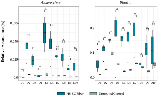 Changes in relative abundance of butyrate producers Anaerostipes and Blautia after 24 h fecal fermentation (10 donor samples, n = 3). **** p ≤ 0.0001, ** p ≤ 0.01, * p ≤ 0.05, not significant (ns) p > 0.05.