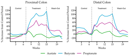 We confirmed these results in a multi-compartment dynamic simulator of the human gut, the Simulator of the Human Intestinal Microbial Ecosystem (SHIME®) model. In this model, the retention time and pH of the vessels were chosen to resemble in vivo conditions in the proximal and distal colon. After an initial control period of 2 weeks, a 3-week treatment period with HS-BG supplementation was performed, with concentrations chosen to mimic a human dose of 6 g/day. To gain insight into the overall changes in microbial activity, butyrate, propionate, and acetate were measured throughout the experiment at various time points (Figure 4). We observed a significant increase in butyrate during the treatment phase. By the end of the treatment phase, butyrate increased by more than 100% from the control phase (115% in the proximal and 102% in the distal colon). In addition, propionate production significantly increased compared to the control period (46% proximal, 50% distal). The levels of acetate fluctuated during HS-BG fiber exposure, but they did not increase significantly at the end of the treatment phase. After cessation of the treatment, the concentrations of these SCFAs returned to their pretreatment levels.