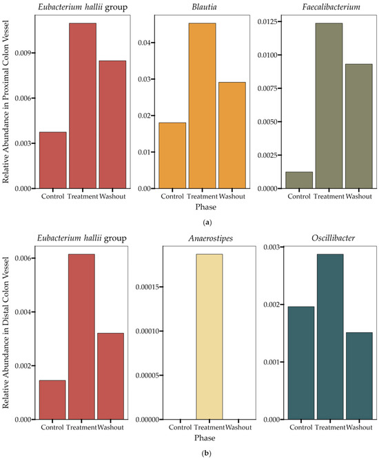 Changes in the relative abundance of butyrate-producing taxa (n = 1) during the SHIME® experiment in (a) the proximal colon vessel and (b) the distal colon vessel. The data displayed represent the final time points taken during the last week in each of the three phases (control, treatment, washout).