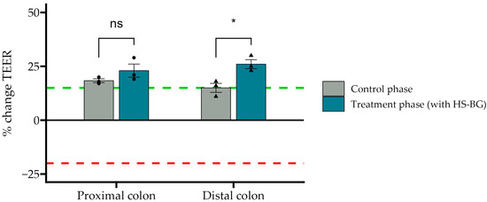 The healthy gut epithelial barrier plays an important and active role in glucose absorption and glycemic control, in addition to many other aspects of human health. When the gut barrier is healthy and tight junctions between epithelial cells are strong, glucose absorption is effective, and macromolecules that may cause inflammation and insulin resistance are not absorbed [34]. TEER measures the “tightness” of tight junctions, and a reduction in the TEER value reveals a loss of barrier function. Using colonic suspensions from the described SHIME® experiment and Caco2 cell cultures, we examined the effect of HS-BG fiber fermentation on the function of the gut epithelial barrier. Colonic suspensions from SHIME® proximal and distal colon vessels were collected before and after the treatment period, diluted in a CM, and given apically to the co-cultures for 24 h. The TEER results demonstrated that supernatants from fermentations of HS-BG fiber in the proximal and distal colon vessels were able to maintain and even further increase the TEER values compared to their initial values (p = 0.02) (Figure 6). The positive control sodium butyrate behaved as expected, increasing the TEER value.