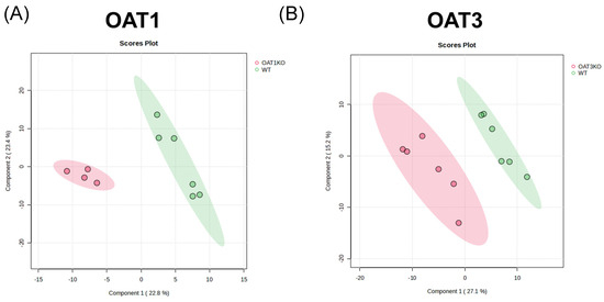 Separation of serum metabolomics of Oat1 KO and Oat3 KO mice for all natural product matches revealed by partial least squares discriminant analysis (PLSDA). (A) Following quantile normalization, log transformation, and pareto scaling of all the matched metabolite counts, separation of the Oat1 KO and WT natural product database matches was determined via PLSDA. There was a clear separation between the knockout and wildtype mice against database-matched natural products. (B) An identical analysis was applied to the Oat3 KO metabolomics study. There was a clear separation of the knockout and wildtype natural products across each genotype.