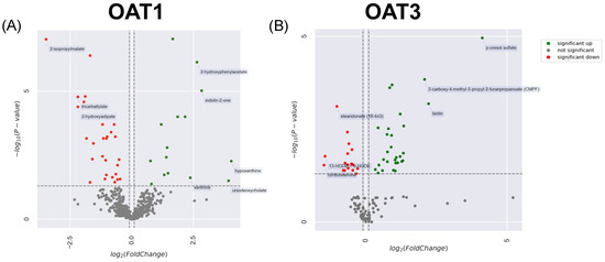 Elevated and decreased natural products in both Oat1 KO and Oat3 KO mice. (A) A volcano plot is included for all natural product matches that were significantly altered by Oat1 KO (30). (B) A volcano plot is included for all natural product matches that were significantly altered by Oat3 KO (46). Green dots indicate significantly elevated metabolites in KO serum (p < 0.05). Red dots indicate significantly decreased metabolites in serum. Asymptotic vertical lines are at fold changes of −0.9 and 1.1.