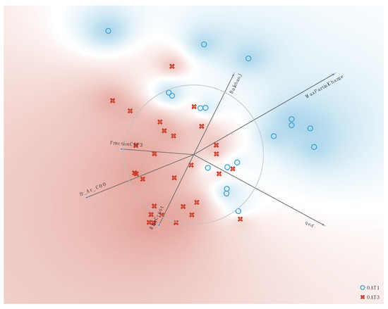 To better understand the chemical properties of the natural products that were altered in the two knockouts, we took a chemoinformatic approach to identify the molecular properties based on the NP structures. More than a hundred molecular properties of NPs altered in the Oat1 KO and Oat3 KO serum were calculated using RDKit [35]. A subset of these appeared useful in distinguishing OAT1- vs. OAT3-dependent NPs in vivo. Some of the most influential of the molecular properties are shown in the Freeviz diagram (Figure 6), a multivariate analysis tool in the Orange environment [36].