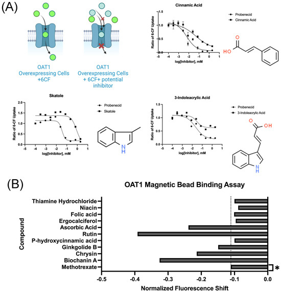 In vitro confirmation of OAT1-interacting natural product matches. (A) Human embryonic kidney cells overexpressing OAT1 transporters were screened using an uptake inhibition assay of fluorescent OAT1 substrate 6-carboxyfluorescin. These were screened against different concentrations of either a known OAT1 inhibitor (probenecid) or the compound of interest. (B) An OAT1 protein binding assay was used to screen natural products of interest. We utilized a magnetic bead binding assay against 6-carboxyfluorescence to screen a set of natural products. This was used to determine compounds that caused a significant shift in fluorescence, revealing a direct interaction between OAT1 and these selected vitamins and plant-derived compounds. * Methotrexate is an established OAT substrate and is used here to compare the relative affinity for natural products, revealing how certain natural products such as biochanin A and chrysin exhibited far greater binding strength to OAT1 than this pharmaceutical.