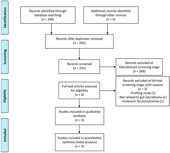 A total of 330 records were identified through the database searches and 38 duplicate records were removed. Out of the remaining 292 records, 286 were excluded based on their title and/or abstract. Six full-text records were screened for the inclusion criteria and three of them were excluded. A list of excluded studies, with reasons for their exclusion, is provided in Supplementary Table S3. For the qualitative and quantitative synthesis (meta-analysis), three studies were included, as shown in the PRISMA Flow diagram (Figure 1).