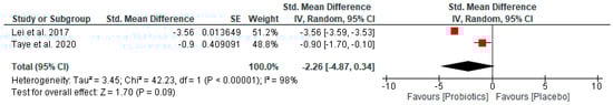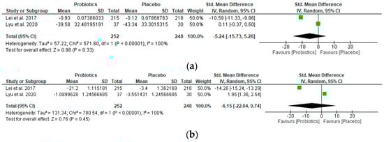 The study outcomes are summarized in forest plots, presenting significant results in favor of probiotic supplementation or placebo for each of the relevant outcomes (Figure 2 and Figure 3). The oral intake of LcS (Lei et al., 2017 [22]; 6-month treatment) and TCI633 (Lyu et al., 2020 [23]; 12-week treatment) did not statistically alter hs-CRP levels in participants (Std. mean difference −5.24 [95% CI −15.73, 5.26]; z-value 0.98; p-value 0.33) (Figure 2a). Similarly, the oral intake of these probiotics did not decrease the WOMAC OA index score in participants (Std. mean difference −6.15 [95% CI −22.04, 9.74]; z-value 0.76; p-value 0.45) (Figure 2b), neither did it significantly lower the WOMAC pain, stiffness, or physical function subscale scores (Table 2).