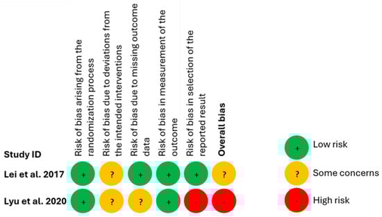 Findings from the evaluation of the risk of bias, using the RoB 2 tool, for the RCTs are presented in Figure 4. Lei et al., 2017 [22] study raised some concerns because deviations from the intended interventions were detected. Lyu et al. (2020) [23], however, were deemed to be at a high risk of bias primarily because an important risk of bias was identified in the selection of their reported results.