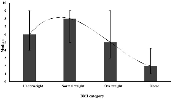 Median satisfaction level of various BMI categories. Error bars represent the interquartile range (IQR); BMI: body mass index; satisfaction was defined by a score of 5 or higher on a 10-point scale, while dissatisfaction was a score below 5.