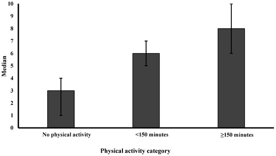 Median satisfaction level of various physical activity levels per week. Error bars represent the interquartile range (IQR); satisfaction was defined by a score of 5 or higher on a 10-point scale, while dissatisfaction was a score below 5.