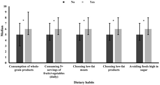 Median satisfaction level of various dietary habits. Error bars represent the interquartile range (IQR); * p < 0.05. Satisfaction was defined by a score of 5 or higher on a 10-point scale, while dissatisfaction was a score below 5.