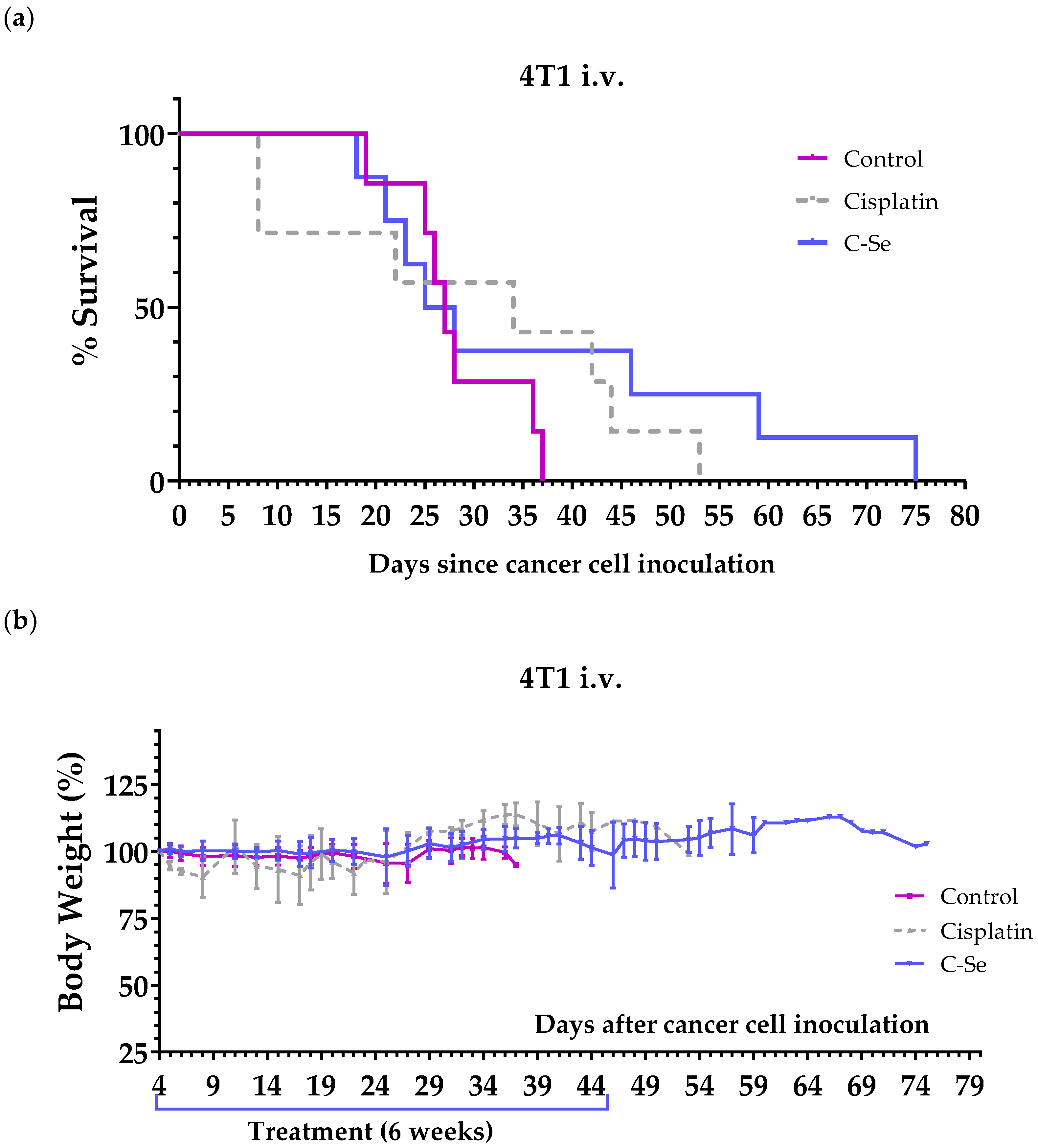 | Triple-negative breast cancer | Pulmonary metastases | 100,000 4T1 cells into the tail vein | Female BALB/cAnNRj | Cisplatin 5 mg/kg i.p. once a week for 4 weeks | 4 |