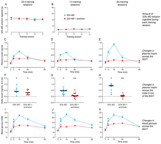 Once the training sessions ended, the mice were subjected to a BGIT with 32% MD + acarbose or 16% MD. A mixed-model ANOVA revealed an interaction of test solution × time across the BGIT for plasma insulin levels in mice with 23 h (