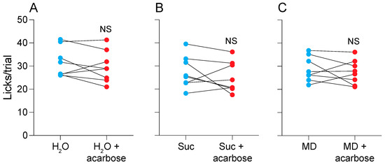 74], it did not increase the acceptability of the water, 32% Suc, or MD solutions to the mice. This implies that the acarbose did not alter the sweet intensity of the test solutions. Third, it was reported that disaccharide solutions elicit larger peripheral taste nerve responses than the same disaccharide solutions treated with α-glucosidase inhibitors [