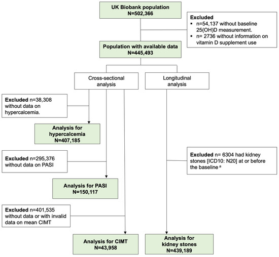 From the total population of n = 502,366 in the UK Biobank database, we excluded individuals without serum 25(OH)D measurements at baseline as well as those without information on vitamin D or multivitamin supplement use, resulting in a population of n = 445,493 available for the subsequent analyses (see flow chart, Figure 1). Due to variations in data availability for each outcome, individuals with missing data for the corresponding outcomes were further excluded from the cross-sectional analyses in the corresponding analytical dataset of hypercalcemia, PASI, and CIMT. Therefore, n = 407,185, n = 150,117, and n = 43,958 participants were included in the three analytical datasets, respectively. In the longitudinal analysis, individuals with a history of kidney stones at or before baseline were excluded, and n = 439,189 individuals were included in the analysis for this outcome.