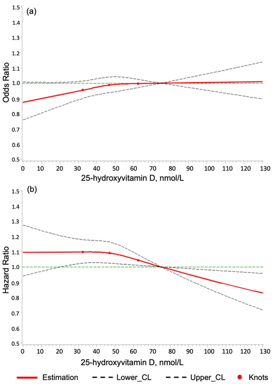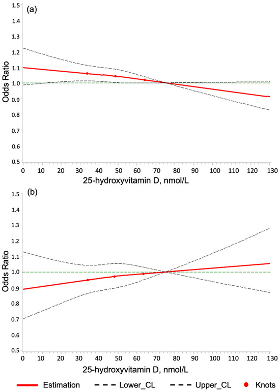 Furthermore, dose–response curves of 25(OH)D levels with the four outcomes were generated using restricted cubic splines (RCS) with three knots positioned at the 25th, 50th, and 75th percentiles of 25(OH)D values and full adjustment for 49 covariates [36,37]. A reference point of 75 nmol/L for 25(OH)D was used.