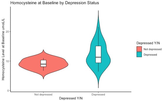 Notably, a higher range of serum homocysteine levels was evident in the subjects who met the cut-off score for depression, reaching as high as 22 µmol/L, whereas those who scored <16 on the CES-D scale peaked at 11 µmol/L (see Figure 1).