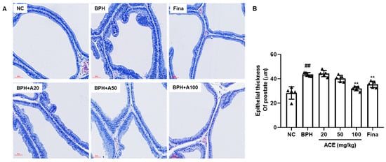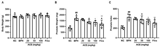 BPH in rats was induced following the method described previously []. Testosterone propionate (TP; Tokyo Chemical Ins. Co., Tokyo, Japan) dissolved in corn oil (3 mg/kg) was administered daily via subcutaneous injection (S.C.) to the animals, excluding the normal control group, for six weeks. The rats were randomly assigned to six groups as follows (n = 5/group): (a) normal control (NC, corn oil S.C. + phosphate buffered saline (PBS) orally (P.O.)) group; (b) BPH (TP 3 mg/kg/day S.C. + PBS P.O.) group; (c) Fina (positive control; TP 3 mg/kg/day S.C. + Finasteride 10 mg/kg/day P.O.) group; and (d–f) ACE (TP 3 mg/kg/day S.C. + 20 mg, 50 mg, 100 mg/kg/day ACE P.O., respectively) groups. The 5α-reductase 2 inhibitor, finasteride, was obtained from Tokyo Chemical Industry Co., Ltd. The materials mentioned above were orally administered on a daily basis for a duration of six weeks. The rats were weighed every week to determine the dosage. Following the last treatment, the animals underwent a 12 h fasting period before being euthanized, at which point whole blood samples were collected from the cauda vena cava. The entire prostate was promptly excised and weighed, and the prostate index was calculated by determining the ratio of prostate weight (mg) to body weight (100 g).