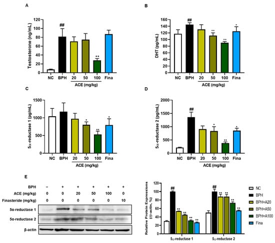 The plasma levels of DHT, testosterone, and 5α-reductase were markedly increased in the BPH group compared to those in the NC group (Figure 3A–D, p < 0.01). The levels of these biological molecules decreased dose-dependently in ACE (AGEprost®)-treated groups. Specifically, the levels of testosterone, DHT, and 5α-reductase1 and 2 were significantly suppressed in the group treated with 100 mg/kg of standardized ACE by 65.65%, 37.81%, 54.79%, and 71.92%, respectively, compared to those in the BPH group (p < 0.01), with no significant difference from the NC group. Finasteride, a known 5α-reductase type 2 inhibitor, significantly suppressed DHT and 5α-reductase type 1 and 2 levels compared to those in the BPH group (p < 0.05). Similar to plasma concentrations, the levels of 5α-reductase type 1 and 2 in prostrate tissues showed a significant increase in the BPH group compared to those in the NC group (Figure 3E, p < 0.01). Both finasteride and ACE (AGEprost®) remarkably attenuated the expression of these enzymes in the prostate relative to those in the BPH group (p < 0.01).